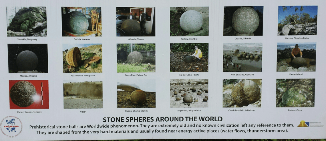 Vor allem: welche Funktion hatten die Steinkugeln? Sie befinden sich heute nicht mehr an ihrer ursprünglichen Stelle und so ist es nicht möglich das original Umfeld in Betracht zu ziehen. Könnten sie eine ähnlich Rolle gespielt haben wie die Keramik Megalithen im Ravnetunnel? Waren sie über Kreuzungen unterirdischer Wasserströme platziert und haben auf diese Weise Energie transformiert und ausgesendet? Bei 90 Kugeln muss es eine sehr große Anlage gewesen sein (Stonehenge mag ca. 160 Steine gehabt haben). Warum ist es wichtig, dass sie rund sind? Warum musste der Quarz entfernt werden?