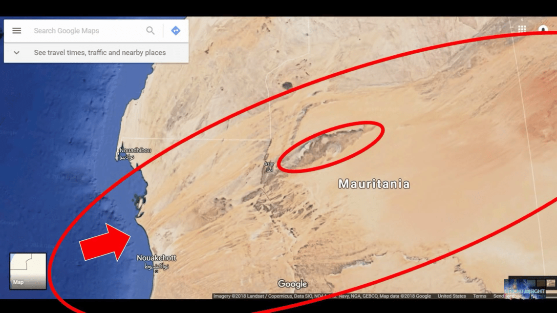Laut Platon soll nördlich der Insel Berge geben und südlich davon der Zugang zum Meer. Das Bild oben zeigt sowohl die Berge im Norden welche einst Wasser führten und den „Abfluss“ im Süden. Dieser wäre dann heutzutage ein paar hundert km vom Atlantik entfernt. Die Forschung (siehe Graham Hancock) weist auf einen Kometeneinschlag hin welche im Nordatlantik vor 12.000 Jahren einschlug. Wer weiß wie das die Küste von Nordwestafrika veränderte. Diesekönnte sich gehoben haben und ein Tsunami das jetzige Saharagebiet überflutet haben. Die Bilder zeigt auch deutlich Spuren von Schwemmungsfluss in Richtung Westen, wie bei einem abfließenden Tsunami.