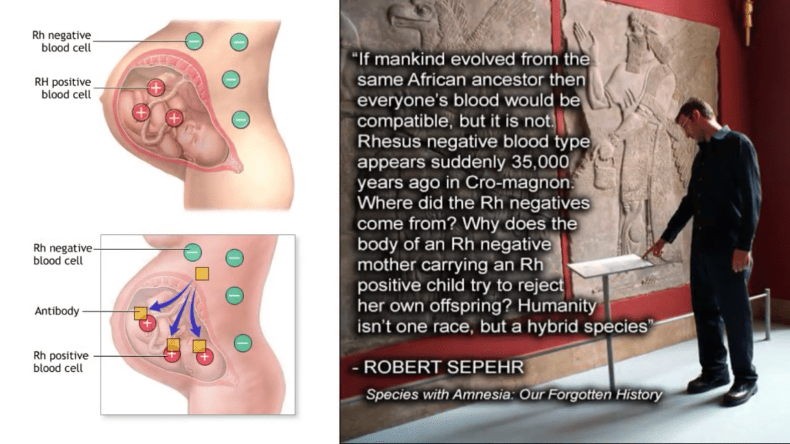 Eine Rh- Frau, die schwanger ist und ein Kind mit Rh+ bekommt, wird durch den Rhesus-Antigen, dass Kind verlieren. Rh+ und Rh- vermischt sich nicht. Es gibt also zwei Spezien Mensch auf der Erde. Es gibt 2 Blutlienen. Wie kann das sein, wenn es doch nur eine Menschheit aus Afrika geben soll?