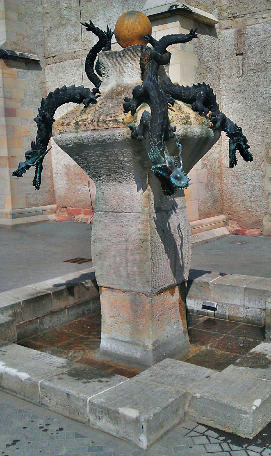 Direkt vor der Marienkirche in Halle (Saale) steht dieser symbolträchtige Brunnen. Vier Drachen umringen eine goldene Sonne und speien Wasser.