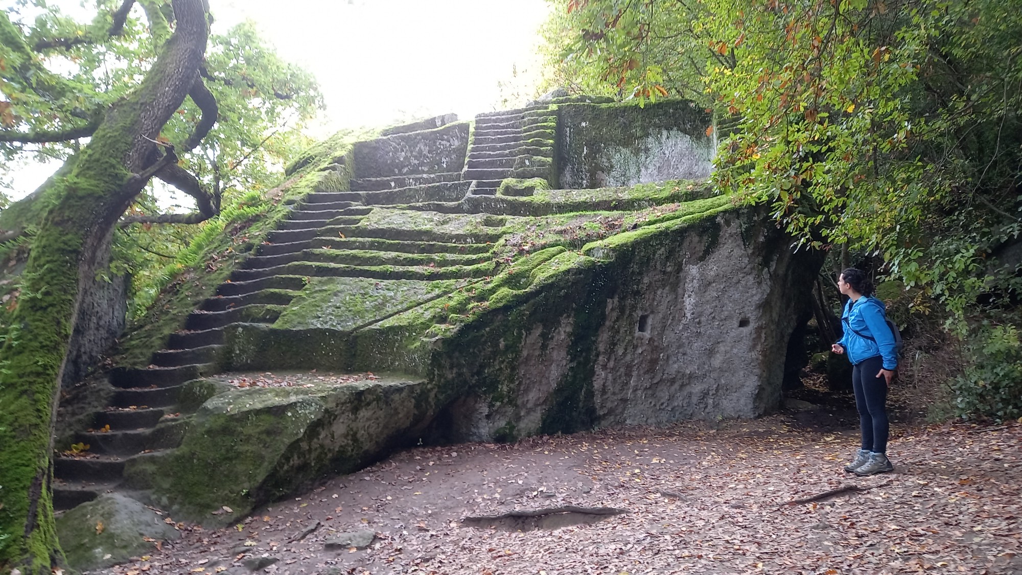 Könnte der Stufenfels ein Bau der Etrusker sein? Gebietstechnisch passt das. Die besagten Rinnen verbinden diese Anlage stilistisch mit der Nekropolis von St. Cecilia, ungefähr 1 km entfernt. Auch die Stufen und Schnittflächen sind hier wie dort sehr ähnlich. Das Problem ist, dass die Sarkophage der Nekropolis keine Übereinstimmung mit Etrusker Sarkophagen hat. Die Etrusker nutzte einfach nur rechteckige Steinkisten, während die von St. Cecilia sargartig sind und den Kopf sehr genau einfassen. Zu den Römern passt das auch nicht, zumal das nicht deren Gebiet ist.
