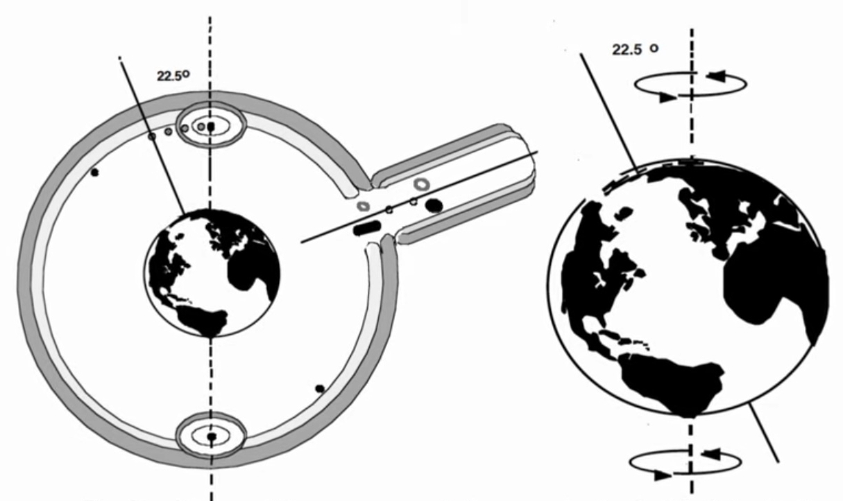 Wenn wir uns jetzt Stonehenge direkt anschauen, so sehen wir den North und South Burrow (Graphik links) um 22,5 Grad von der Achse verschoben. Das entspricht dem Winkel der Erdachse, bzw. den Weg der Präzession des Frühlingspunkt. Dies ist ein ca. 26.000 Jahre dauernder Weg wo der Frühlingspunkt durch die 12 Tierkreiszeichen wandert. Dafür benötigt der Frühlingspunkt (heute 21. März) ca. 2000 Jahre pro Zeichen. Aktuell bewegen wir uns von den Fischen in den Wassermann.