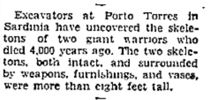 Das Thema der Riesen von Sardinien wird leider sehr unter dem Teppich gehalten, wie es weltweit der Fall ist. Im 19. Jahrhundert gab es weltweit dazu noch viele Veröffentlichungen, wurde aber immer weniger. 1953 schaffte es eine Meldung von Reuters in eine Kanadische Zeitung.